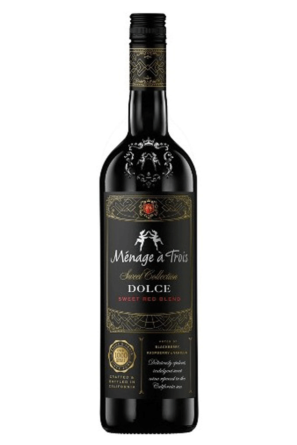 Ménage à Trois Dolce Sweet Red Blend will surely win you over. Brimming with decadent blackberry and raspberry flavors accented by warm notes of cherry vanilla, this rich wine is lively on the palate, lifted by delicate, light carbonation and crisp acidity. Go from the everyday to the extraordinary in just one sip.